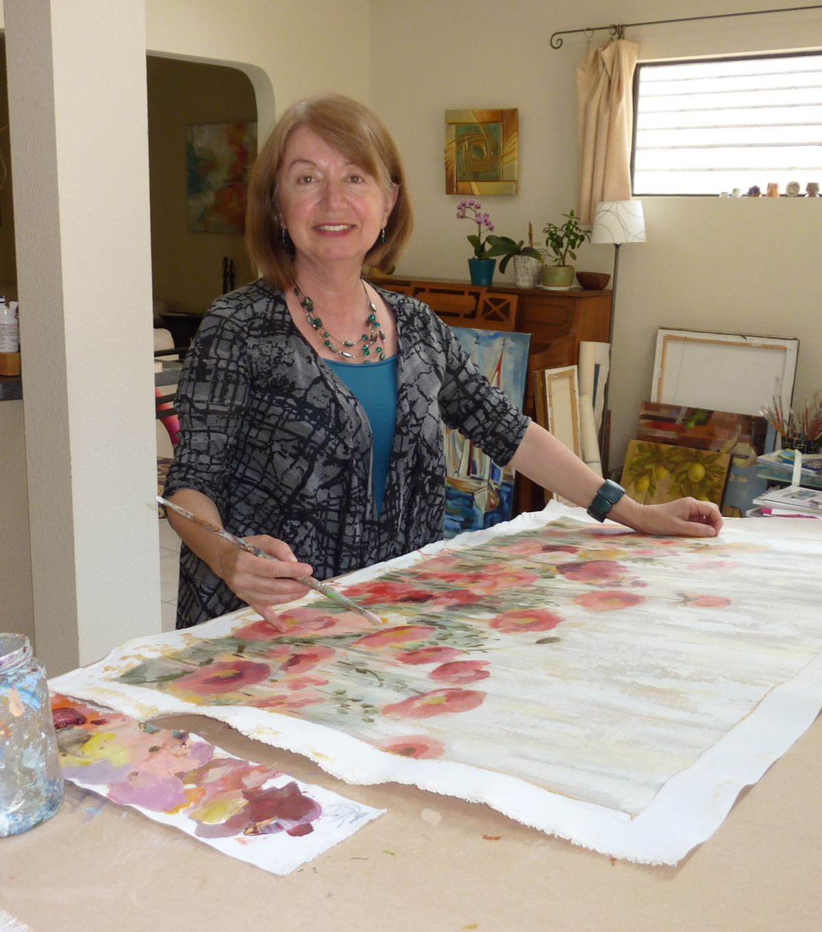 American Artist Silvia Vassileva pictured painting a large-scale floral abstract.